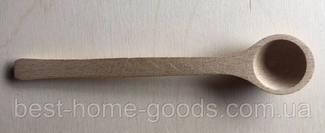 Дерев’яна ложка довжиною 15 см, шириною 30 мм, з гладкою закругленою лопаттю і міцною, комфортною дерев’яною ручкою. Виготовлена з натурального бука без додаткової обробки хімікатами. Легка і практична, підходить для використання з будь-яким типом посуду, включно з антипригарним.