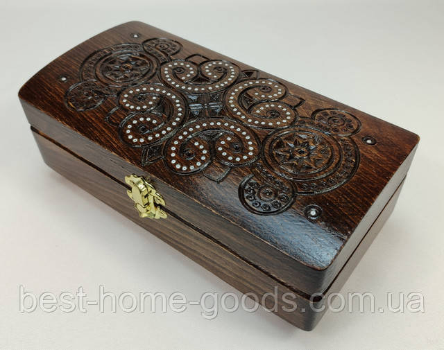 Ексклюзивна різьблена купюрниця-скринька ручної роботи з натурального горіхового дерева, виготовлена карпатськими майстрами. Витончена скринька коричневого кольору доповнена елементами інкрустації, що підкреслює її унікальність та стиль. Оксамитове дно забезпечує безпечне та акуратне зберігання купюр і цінностей. Практична прямокутна форма й етнічний орнамент роблять цей виріб не лише функціональним, а й яскравим декоративним елементом. Абсолютний фаворит серед покупців за останній період.