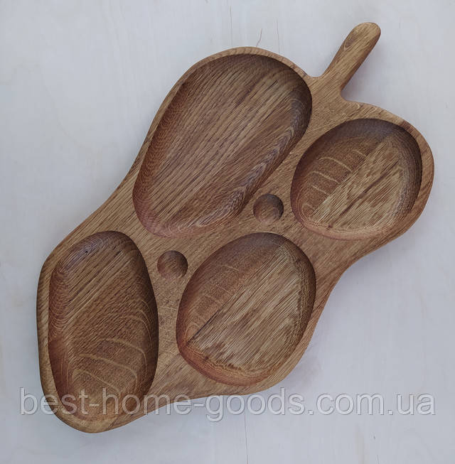 Натуральне дерево (дуб), фігурна форма, довжина 42 см, ширина 23 см, висота 2 см, 6 роздільних секцій, оброблена лляною олією, приємна на дотик поверхня, природний запах деревини, ручна робота, стійка до вологи, багаторазове використання, екологічно чистий посуд, безпечна для їжі, виготовлено в Україні.